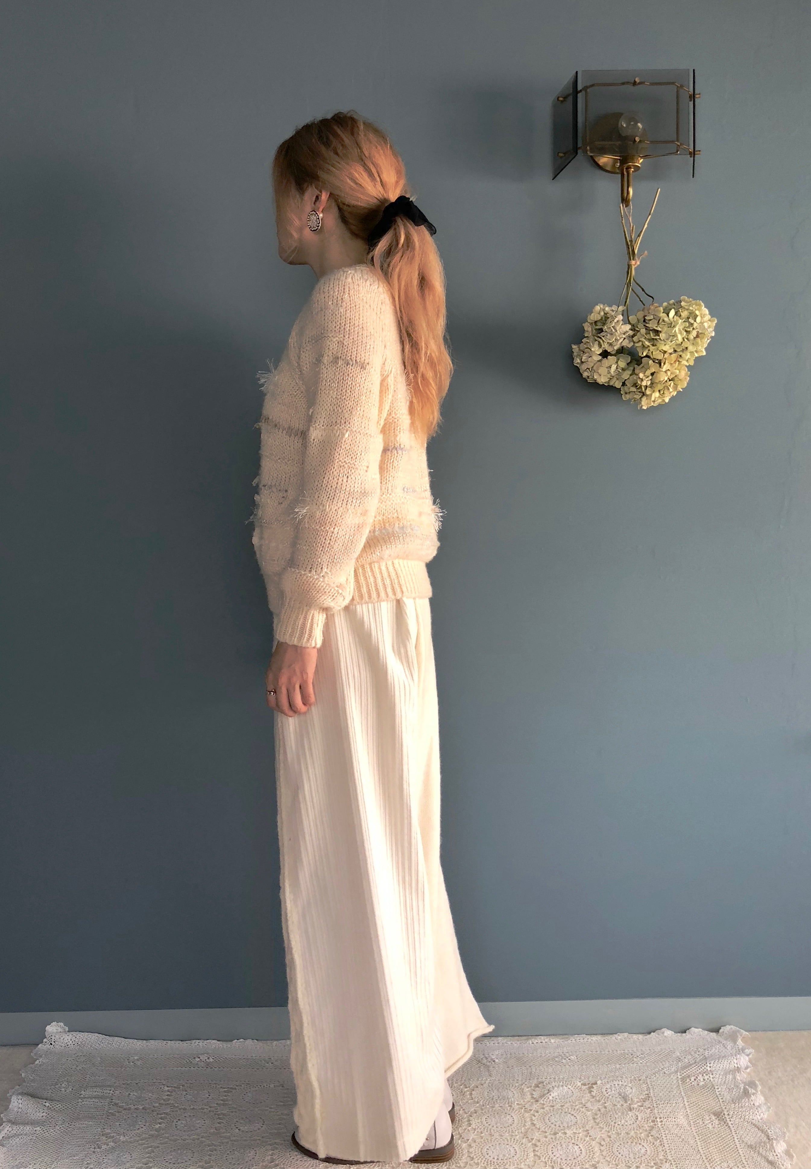 色々な糸を引きそろえた糸に、様々な生地やファンシーヤーンも一緒に編み込んだ編み地を、ラグランスリーブのシンプルなニットに仕立てました。