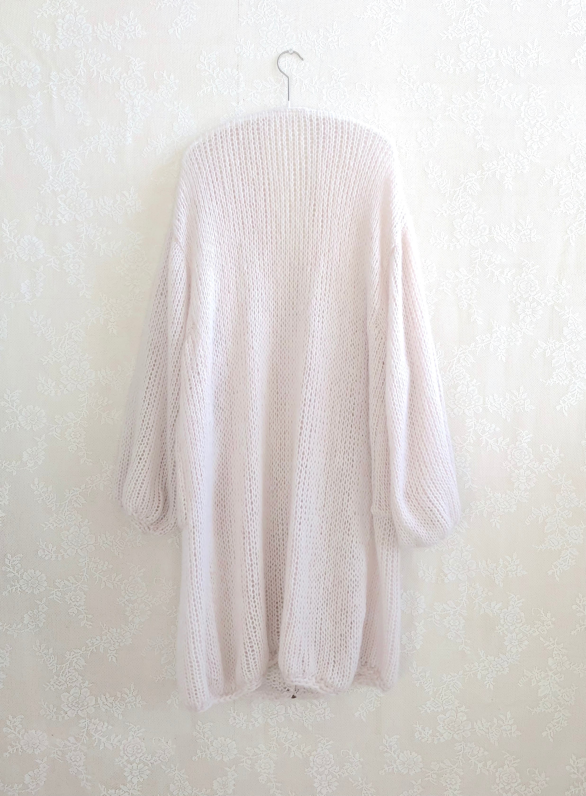 上質な細いベビーアルパカ素材の糸を数本引き揃え、エアリーな編み地のカーディガン。ふんわりとボリューム感がありますが、非常に軽く暖かく仕上げています。ダレて型崩れしない様に、少し縮絨をかけています。お袖も程よいボリューム感です。