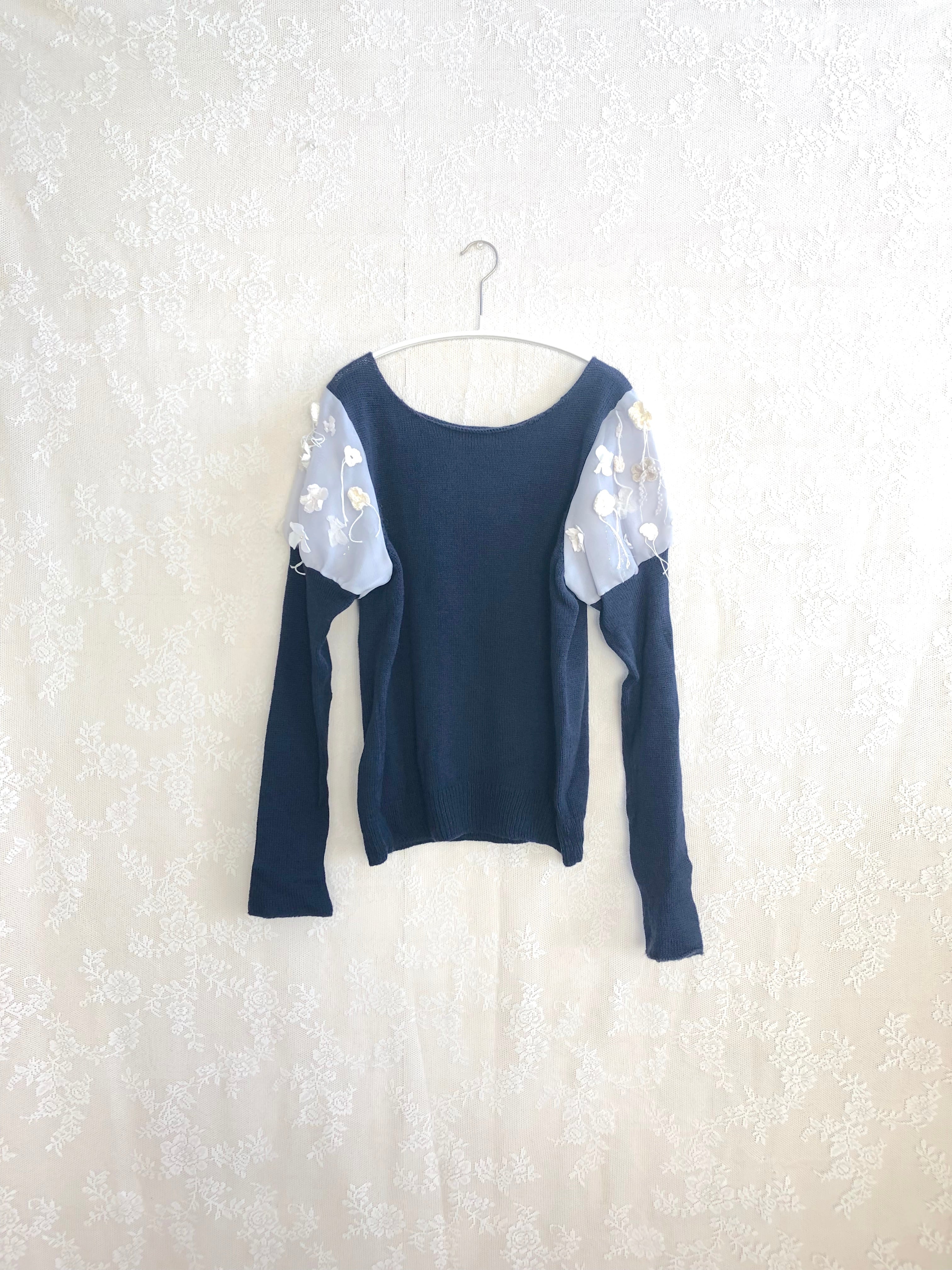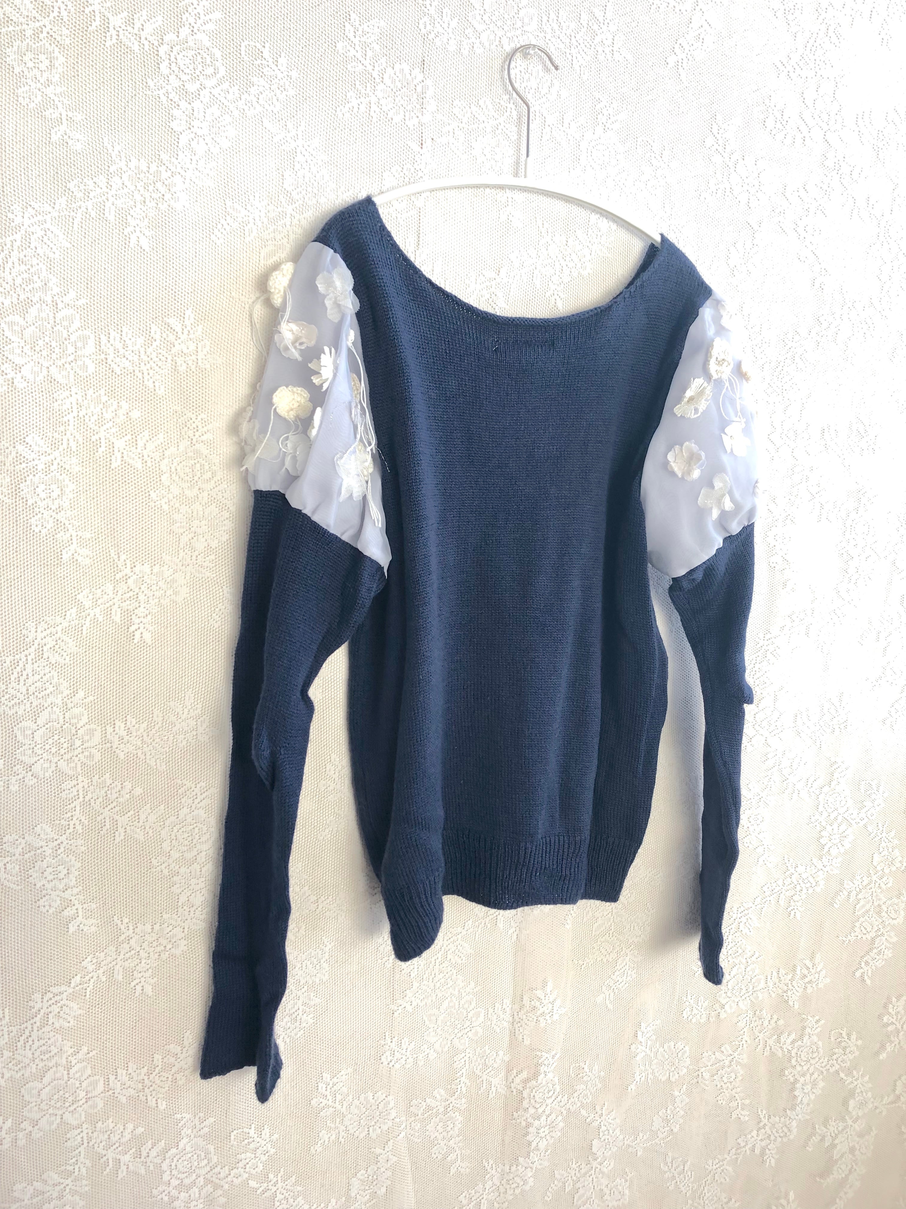 パフスリーブにお花のついたニットです。お袖はオーガンジーとシフォンの2枚仕立てになっています。肌触りの良いキャッシュウールで、薄く軽やかですが非常に柔らかく暖かいです。肘の部分がぽこっと出る編み方になっており、とてもかわいいです。