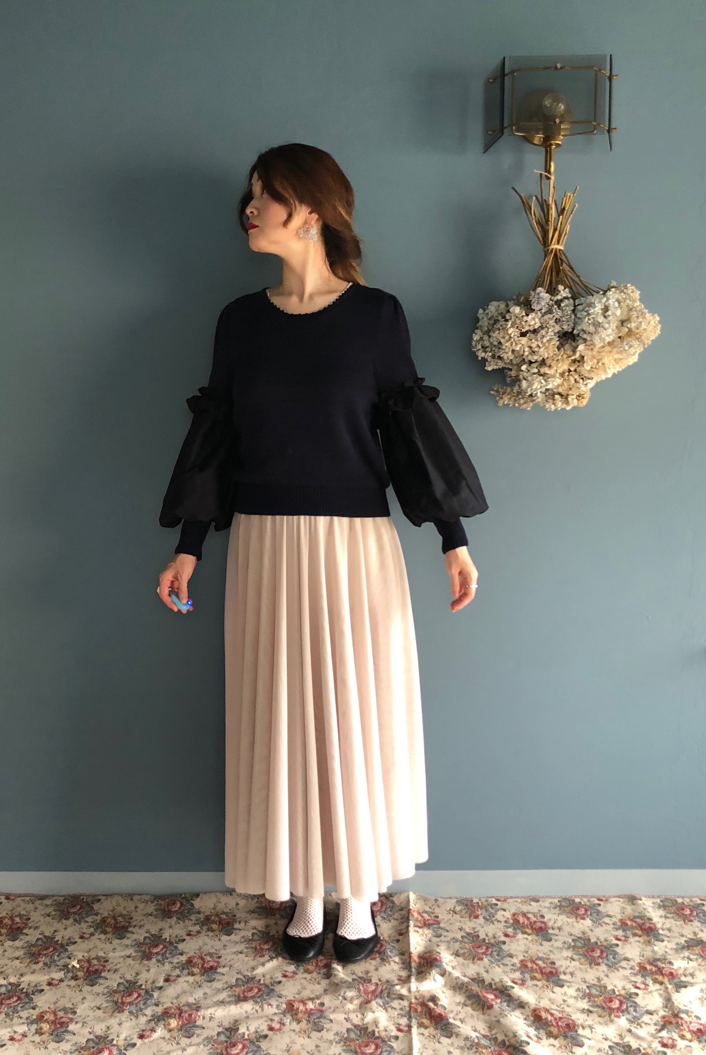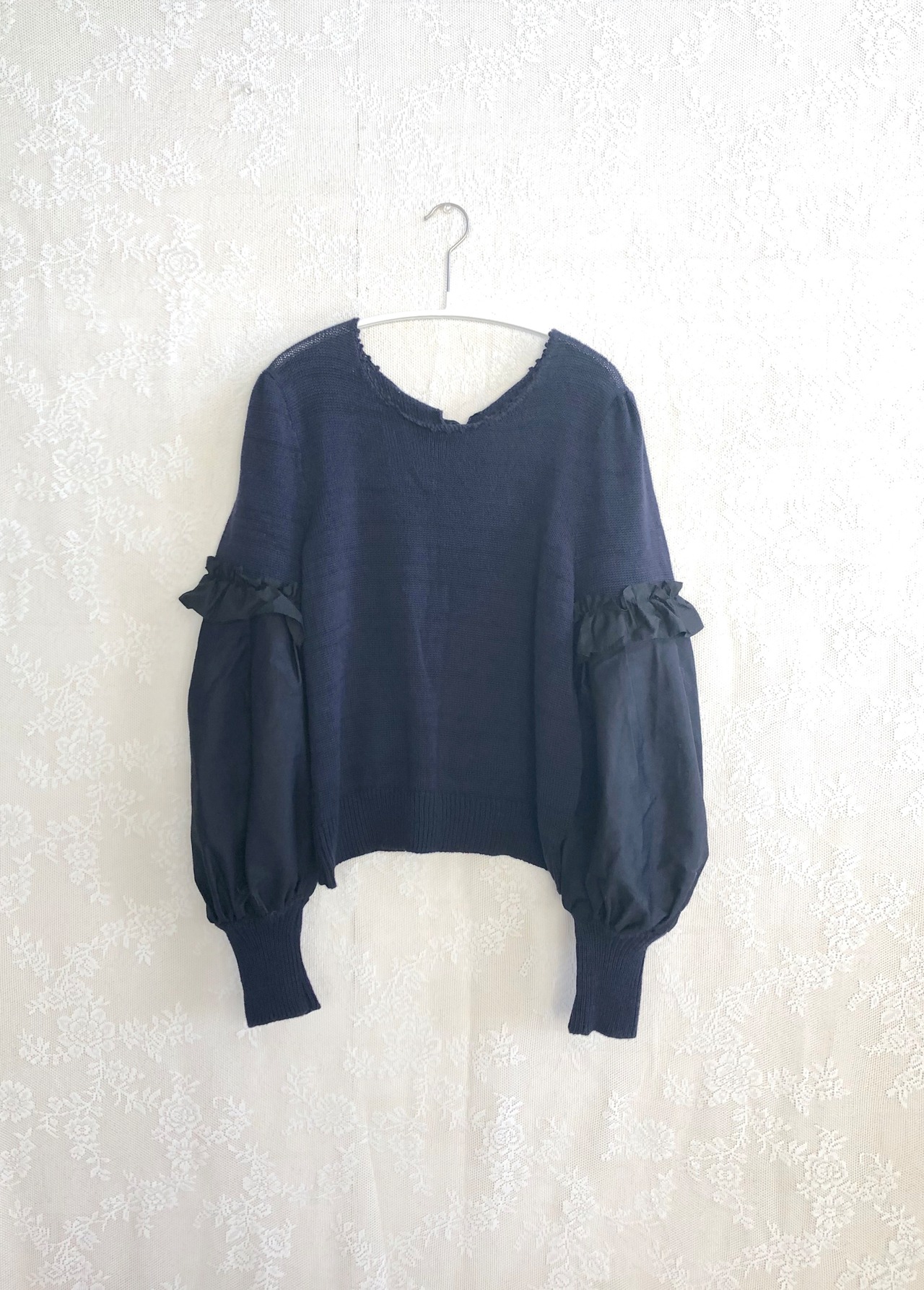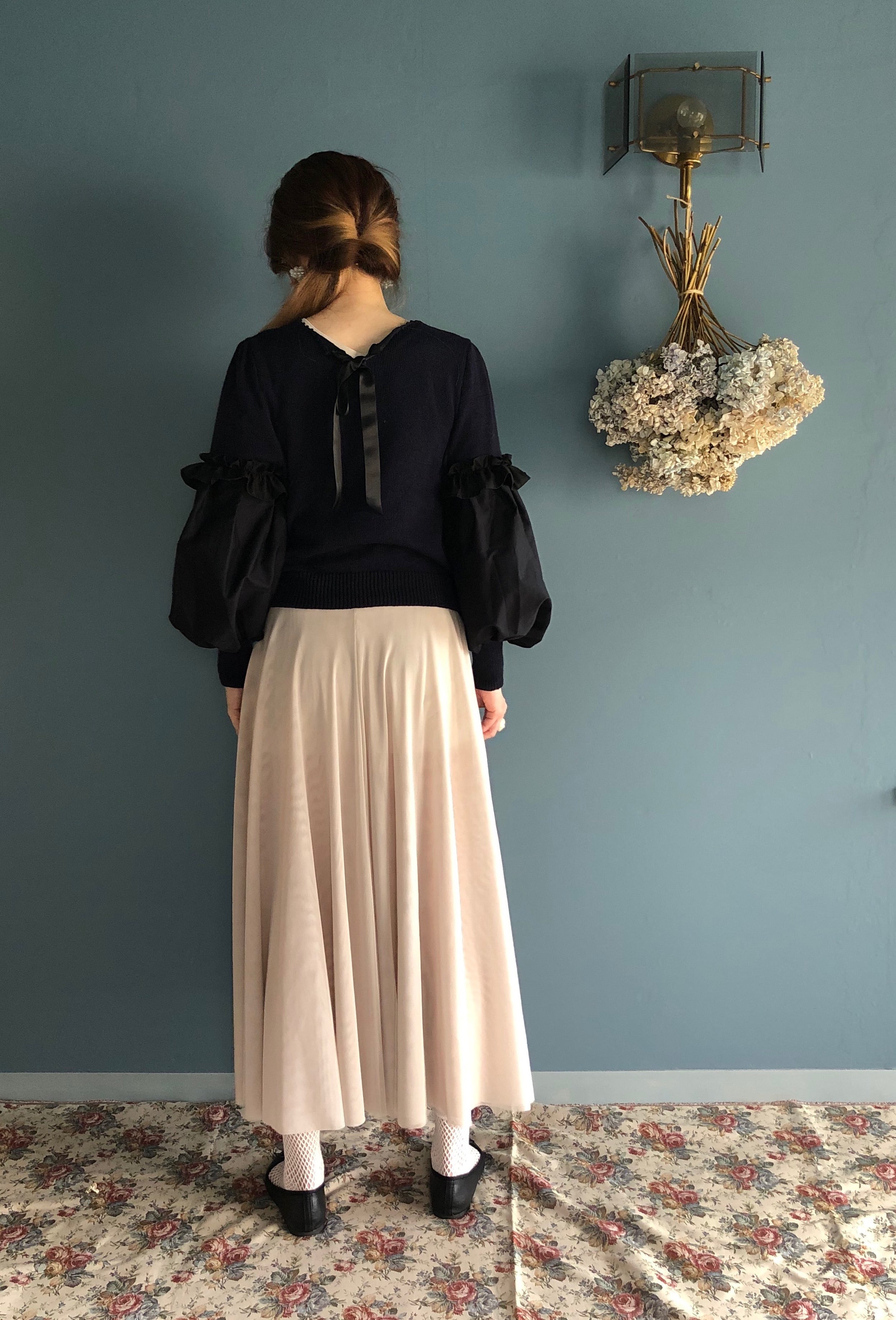 Poodleknitの様なシルエットで、袖のパフ部分が布帛に切り替わったニットです。袖口のボリュームがポイントです。